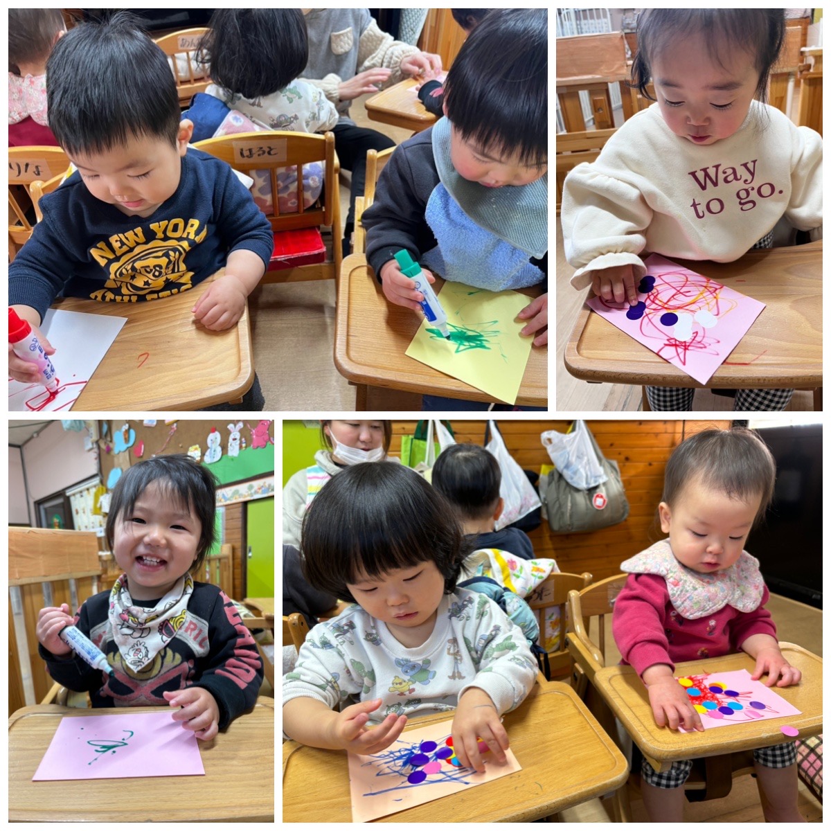 もうすぐお店屋さんごっこ♪マーカーでジロジロ、シールをペタペタ…お兄ちゃん、お姉ちゃんに初めてお手紙を書きましたよ。お返事が楽しみだね〜(^o^)