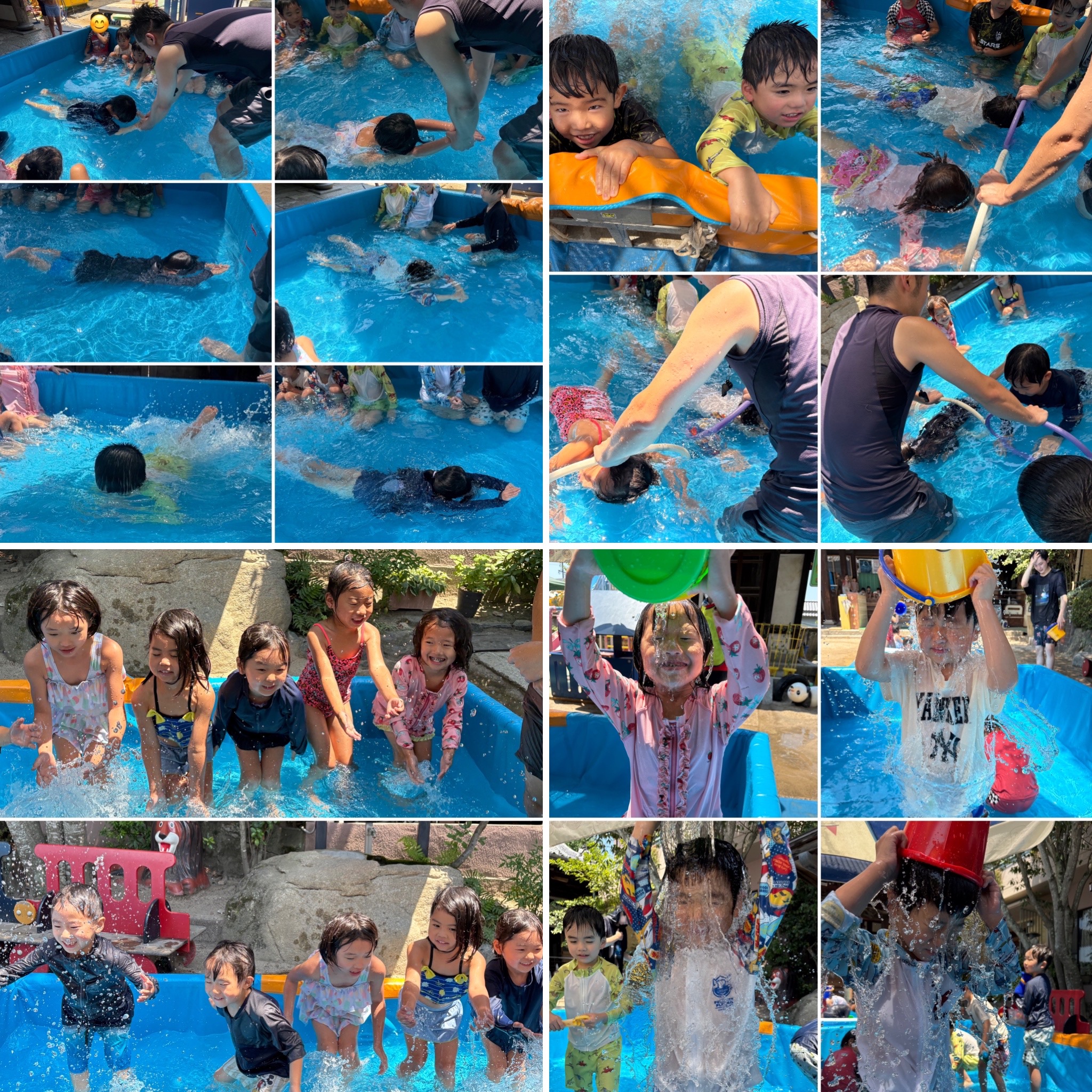随分とプールにも慣れてきました!みんなの「頑張れ!」の応援で力が出て1人、また1人と顔をつけるようになり成長を感じています。苦手な子もいますが、少しずつでも頑張る気持ちが出てきているようです。最後の遊びの時間にバケツの水を頭から掛ける子も!水が大好きなのが伝わります☆