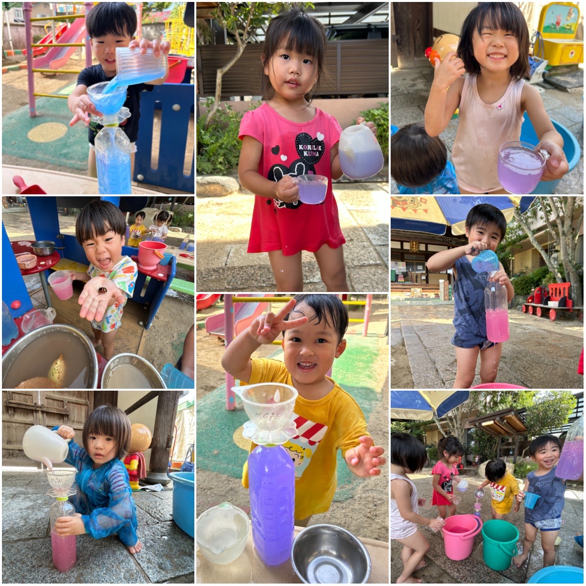 今日も色水を使ってジュース屋さんを楽しみました。青とピンクの色水をさっそく、ブレンド。『あっ!紫じゃ〜!』すると、『どうやって作ったん?』『えっとね〜、まずこれを入れて〜……』と友だち同士で教え合いこが始まります。あと、子どもたちの発見!ピンク色のバケツに青の色水を入れると、紫色になりました。でも、汲み上げると、あれ?青色だ〜、あら不思議。