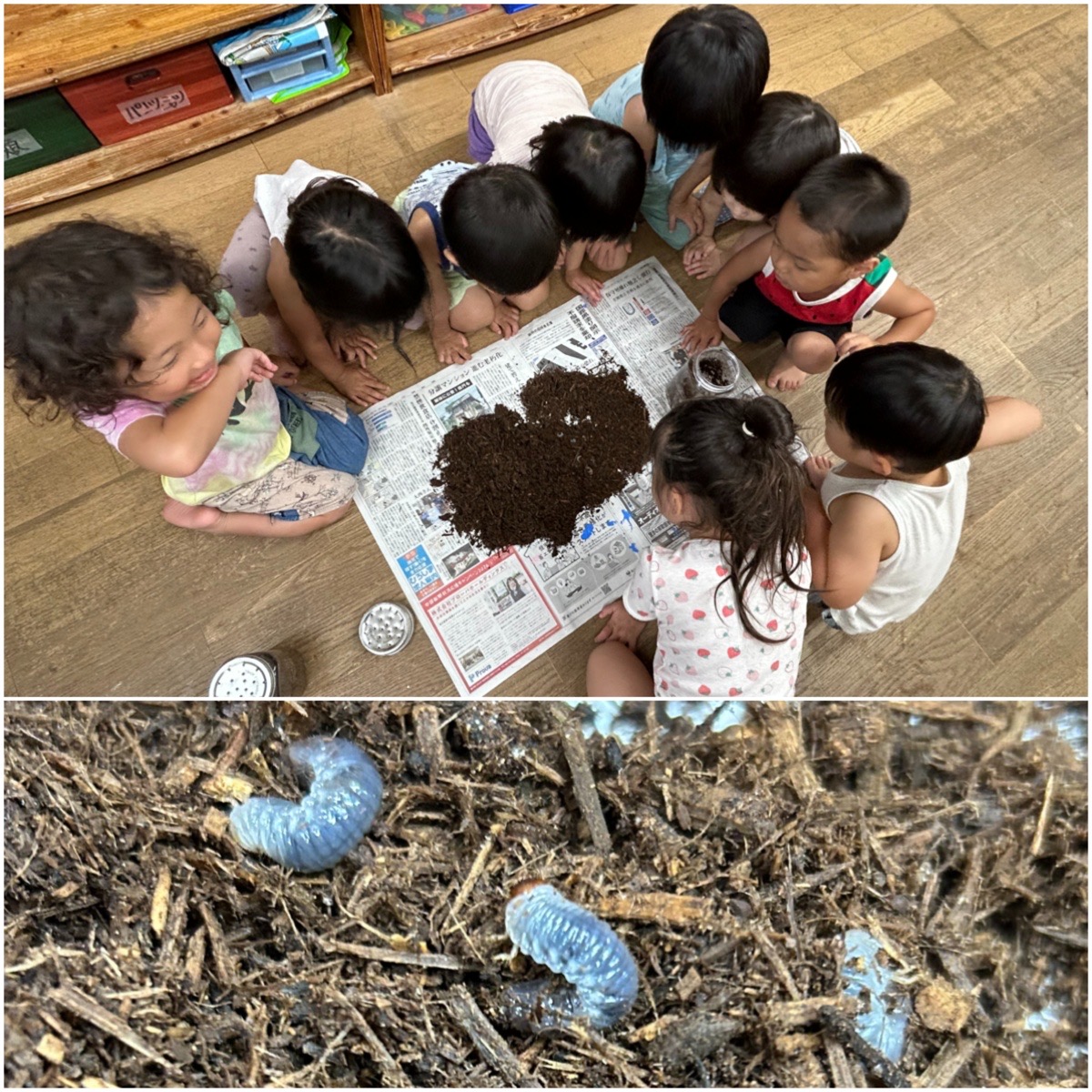 久しぶりの保育園でみんなお友だちと顔を合わせると『あ!〇〇ちゃ〜ん!〇〇く〜ん!』と嬉しそうでしたよ。カブトムシの卵がどうなったかな??みんなで見てみると…