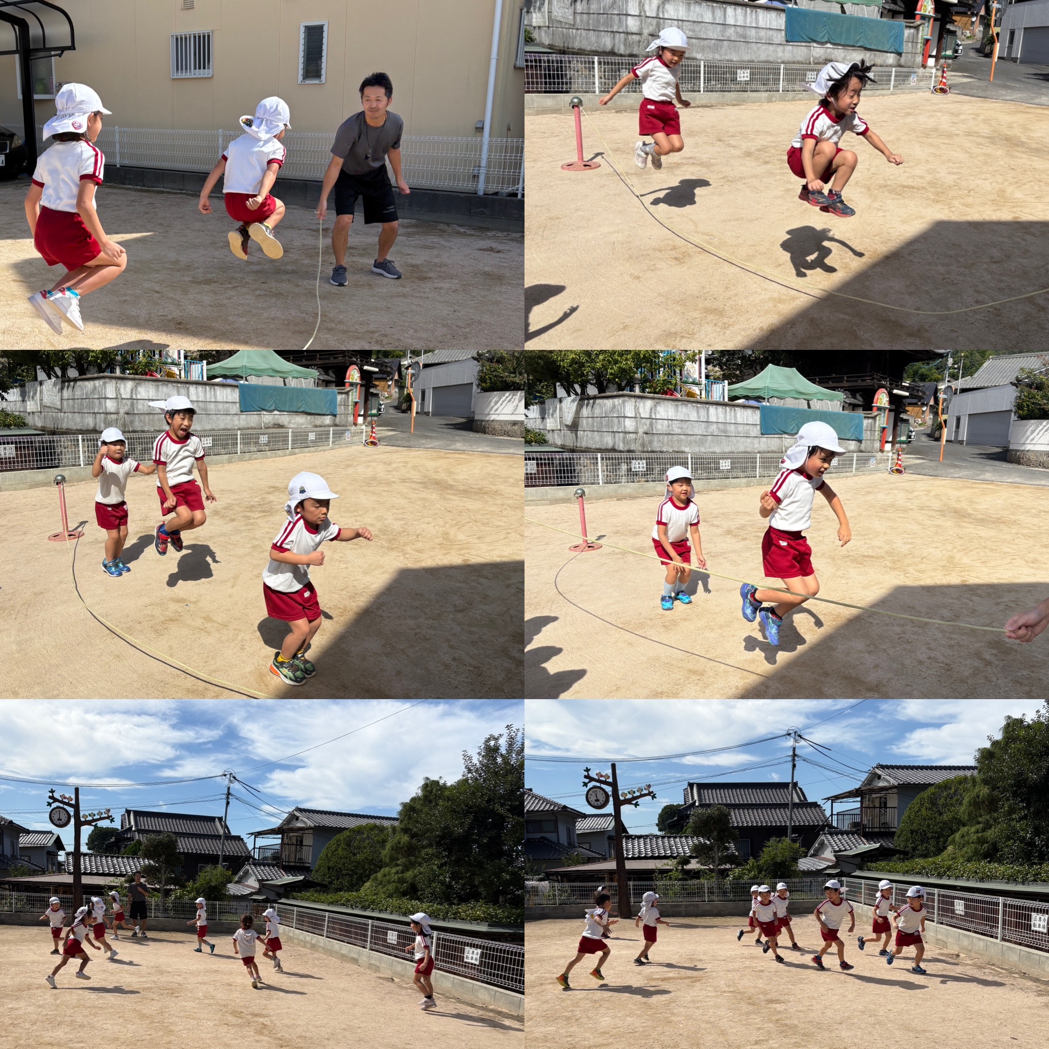 今日は体育指導でした。長縄跳びを段階を踏みながら練習していきましたよ。山中先生が上げた縄を3秒、2秒で下がる間にくぐり抜けたり、縄をジャンプしたり…徐々に先生が回す縄の中にタイミングを見ながら入っていく練習もしました。最後は恒例の鬼ごっこでしっかり体を動かしました!