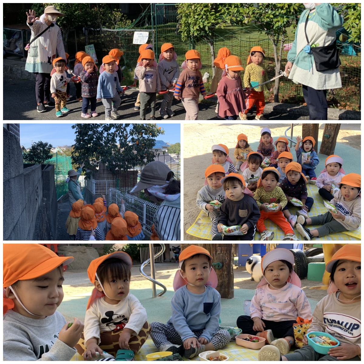 秋を見つけに行きました。柿が沢山なっている木をみながら「食べたいねー、落ちてこんかねー」と声をかけながら!そうそう、今日はお母さんの手作り弁当が待っている…子ども達、よく食べました!美味しかったんでしょうね!朝早くからありがとうございました。