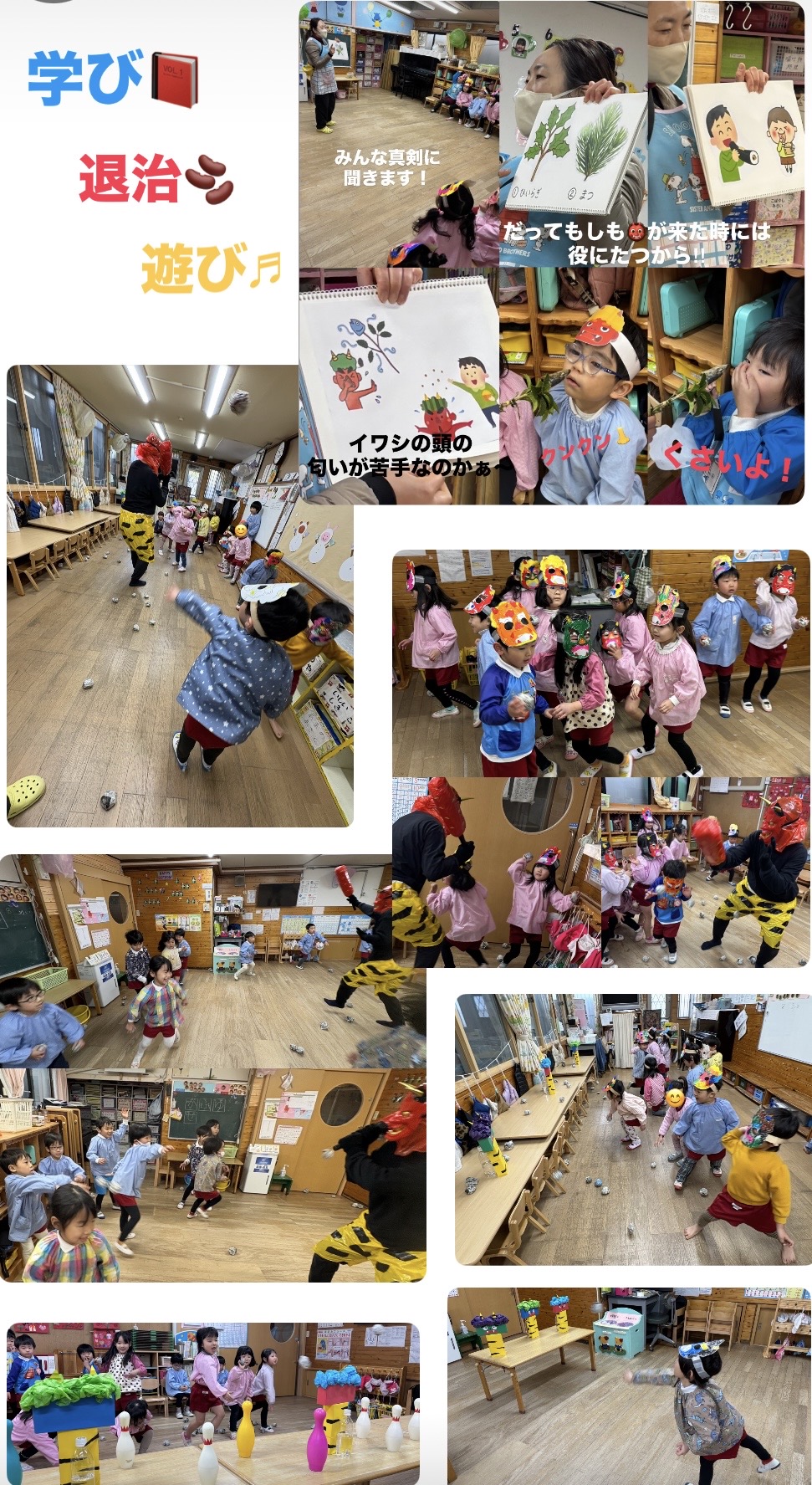 今日は節分の日!ご家庭でも豆まきをされるお家も多いのかなと思いますが、保育園でも元気いっぱい鬼退治しましたよ!感染症対策として各クラスでの「節分会」にはなってしまいましたが、子どもたちは楽しめたようです。