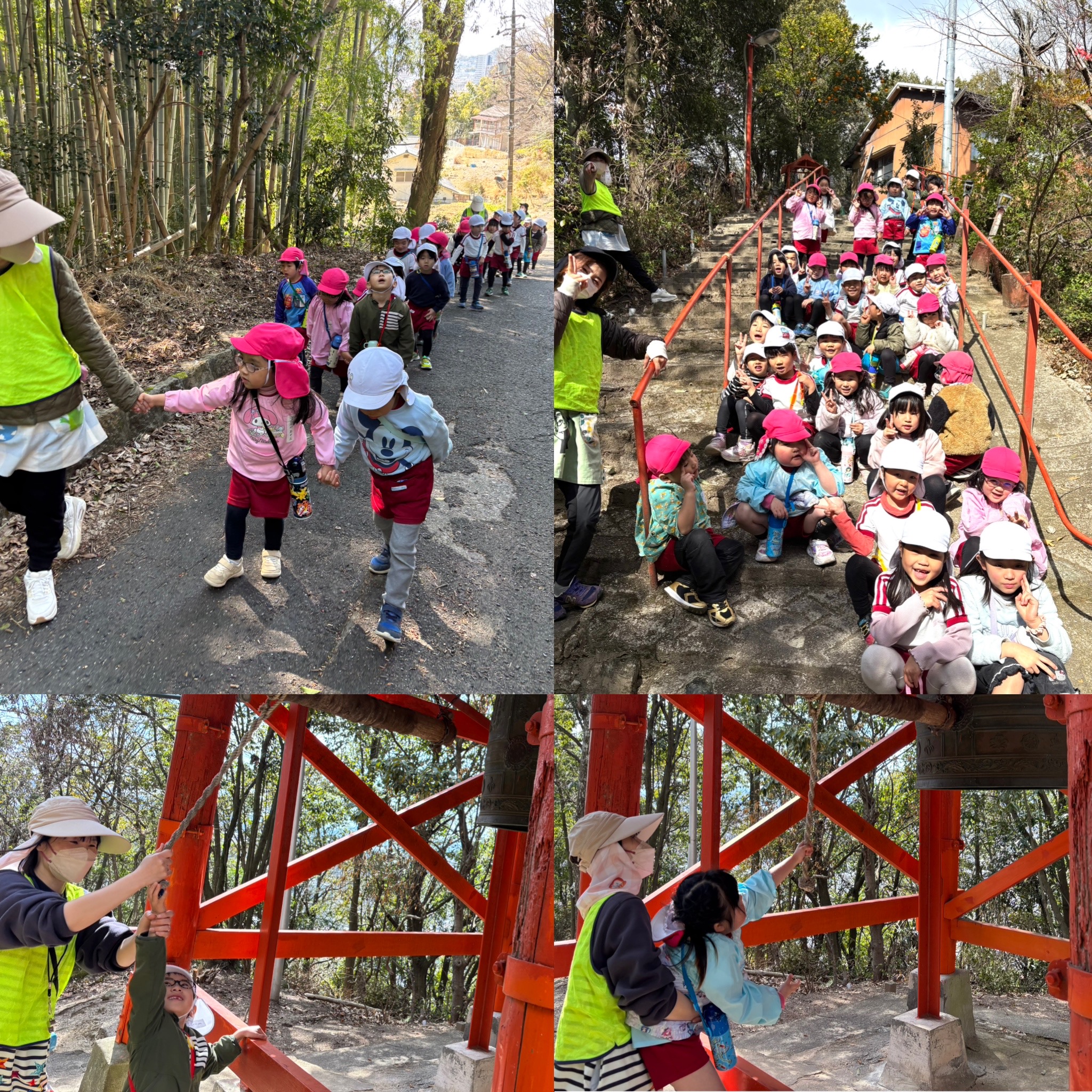雲が少ない青空!岩滝山の鐘撞堂までお散歩へ!!「白組さんとはあと何回一緒にお散歩にいけるかな?」そんな話をしながら桃組さんは白組さんを見習って一生懸命歩きました。今日は各クラスのお当番さんが鐘を鳴らしてくれましたよ!
