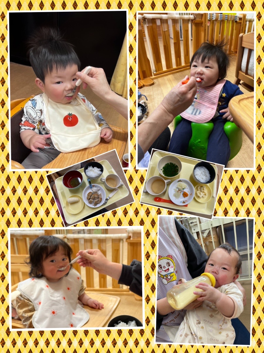 毎日、給食先生が それぞれに合わせた離乳食を作ってくれます‼︎ 大きなお口で アーン(^○^)
